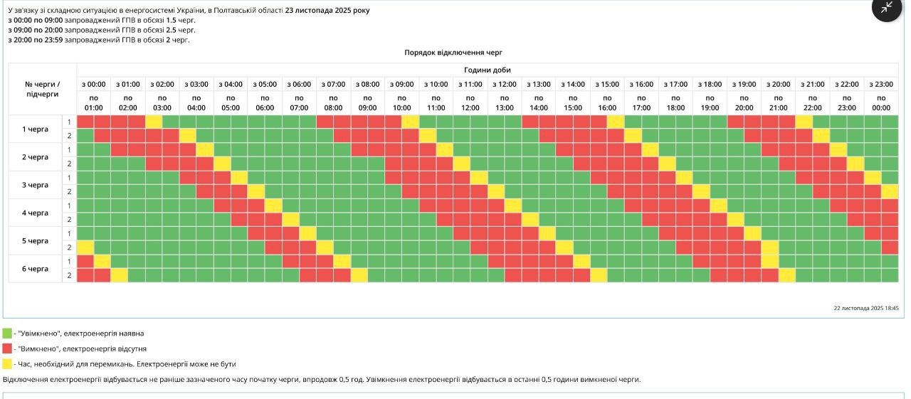 «Полтаваобленерго» повідомило графік погодинного відключення електроенергії на неділю, 23 листопада.