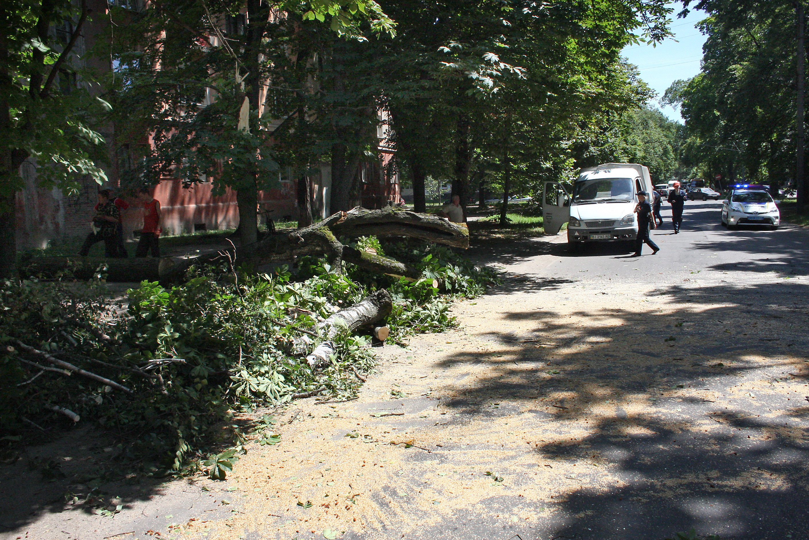 У Полтаві зранку великий каштан перекрив рух вулицею Пушкіна. Дерево впало на тротуар та проїжджу частину. При цьому старим або пошкодженим не виглядало. Стовбур і гілки розпиляли працівники КП "Декоративні культури".