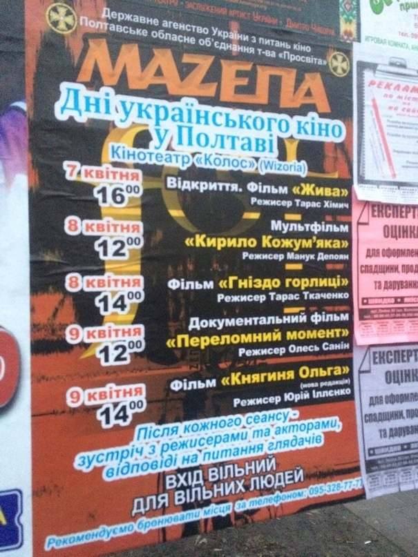 У Полтаві дні українського кіно в рамках фестивалю "Мазепа-фест" відбудуться 7, 8 та 9 квітня в кінотеатрі "Колос". Вхід для глядачів буде вільним.