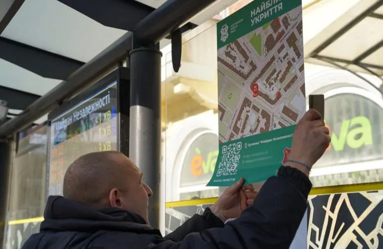 У Полтаві на зупинках громадського транспорту з’явилися покажчики з адресами та QR-кодами укриттів.