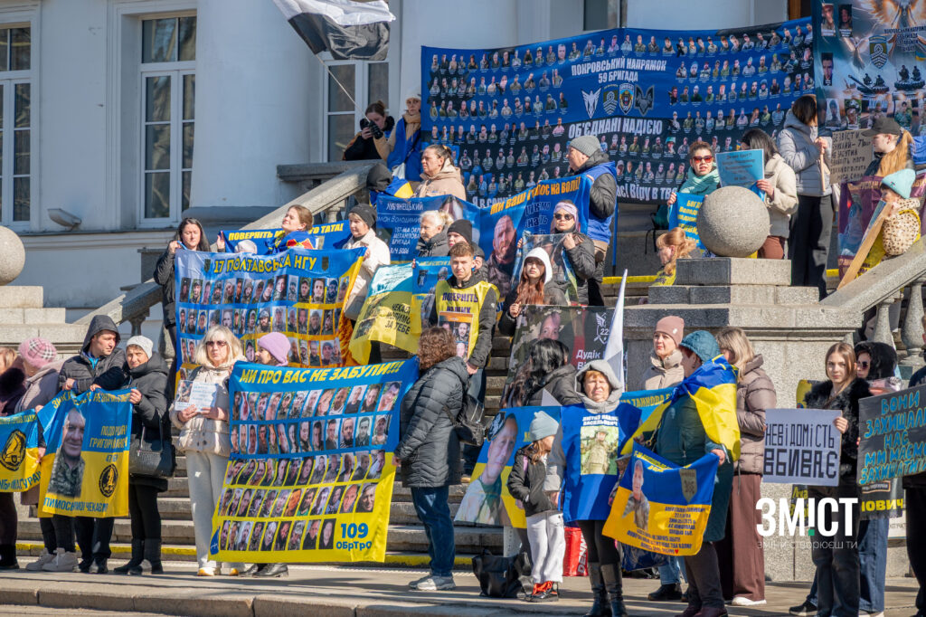 Акція-нагадування організована Полтавською спільнотою родин захисників Азовсталі та Маріуполя. ЗМІСТ побував там 8 березня аби підтримати родини військовополонених, які прийшли нагадати про воїнів.