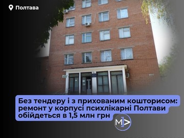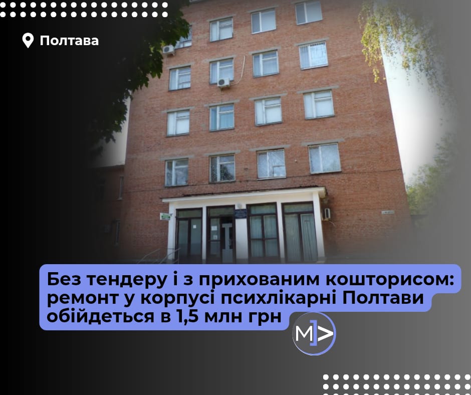 Обласний заклад з надання психіатричної допомоги Полтавської обласної ради уклав пряму угоду на аварійний ремонт санітарних приміщень у третьому блоці головного корпусу. Вартість робіт — 1,52 млн грн.