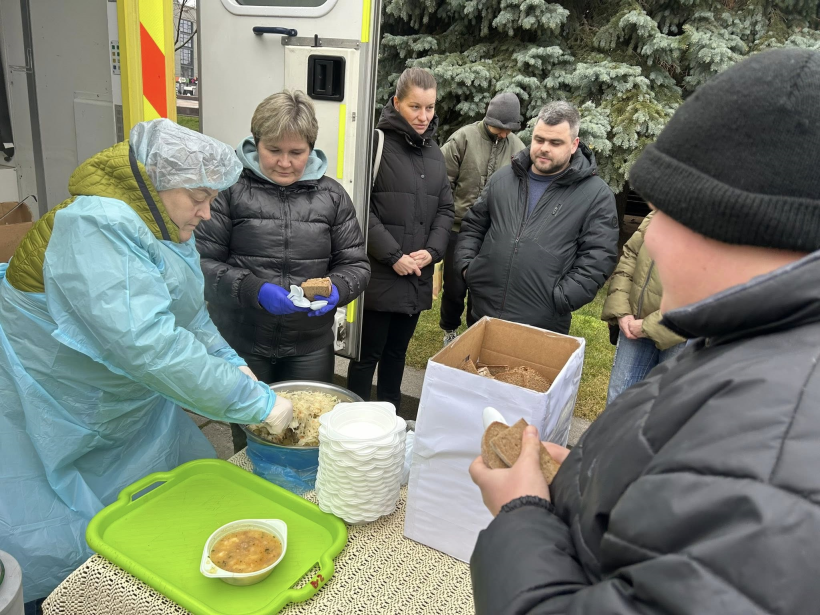 Поблизу Південного вокзалу в Полтаві щодня у будні об 11:00 роздають гарячі обіди, чай, каву та солодощі. Акцію організував благодійний фонд «Карітас Полтава», щоб підтримати людей у період морозів.