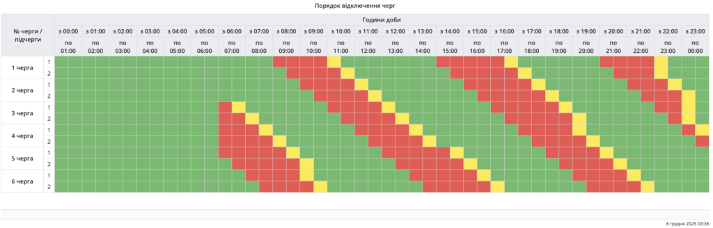Знеструмлення охоплюють шість черг споживачів. Вони триватимуть від пів години до 2,5 год для кожної з черг у різний час доби: