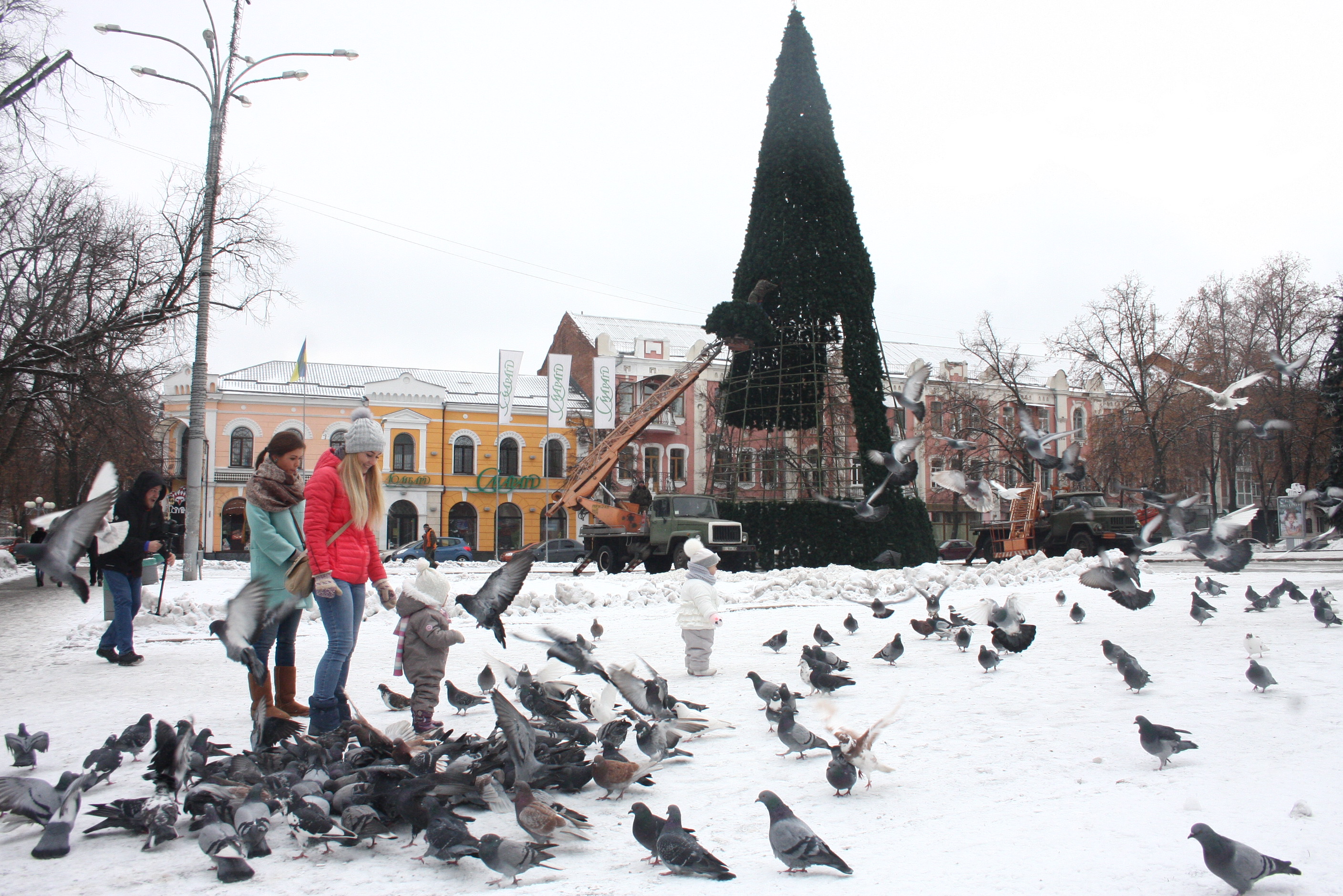 У Полтаві на Театральній площі встановлюють головну ялинку міста. Роботники комунального підприємства "Декоративні культури" на металевому каркасі закріплюють гілки. Ялинка буде штучною, для її виготовлення живих дерев не використовують.