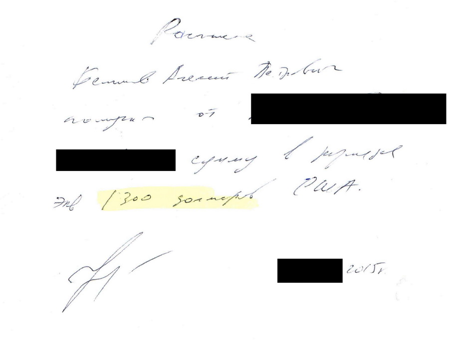 У нашому розпорядженні опинились унікальні документи. Це розписки, за якими Беліков брав з підприємців десятки тисяч доларів. Куди потім йшли ці гроші – невідомо. Іноді він зазначав, що «на оформлення процедур», і зобов’язувався повернути гроші, якщо "оформлення процедури" не відбудеться.