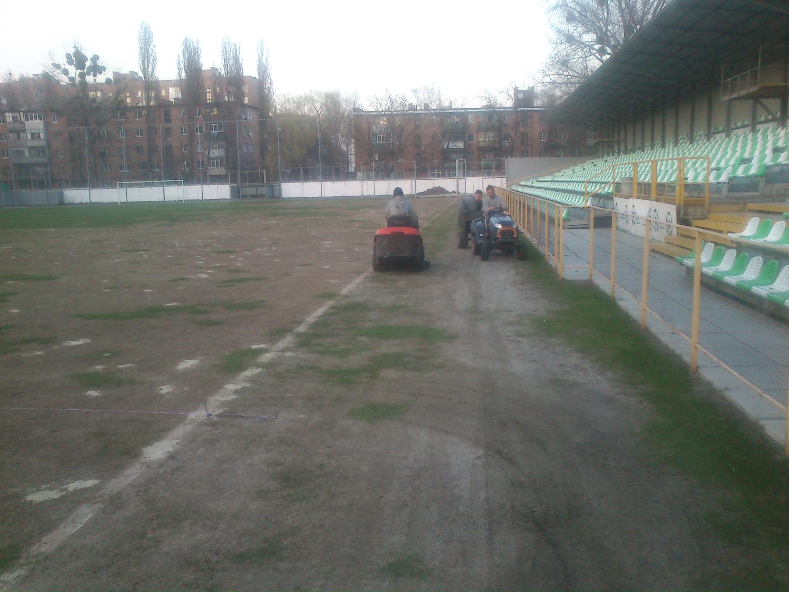 Разом із тим, фланг, котрий ближчий до входу на стадіон, досі лишається земляного кольору з невеличкими зеленими острівцями. Там не голий грунт - там трава, але вона не зелена. Виною всьому - морози і відсутність підігріву на стадіоні, через що частина трави просто вимерзла. А навесні звідти воду вимакували, через що з травою й виникли проблеми.