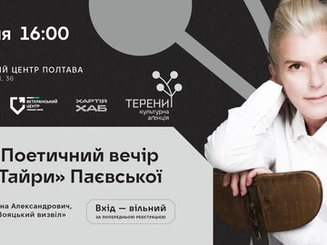 11 січня о 16:00 «Терени» спільно з просвітницьким простором 2-го корпусу НГУ Хартія «Хартія-Хаб» та Ветеранським центром Полтави запрошують на поетичний вечір Юлії «Тайри» Паєвської.