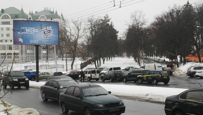 На перехресті Леніна й Першотравневого проспекту утворилася велика пробка. Автомобілі стоять із вимкненими двигунами, пробка тягнеться убік Центру. На місці немає працівників ДАІ.