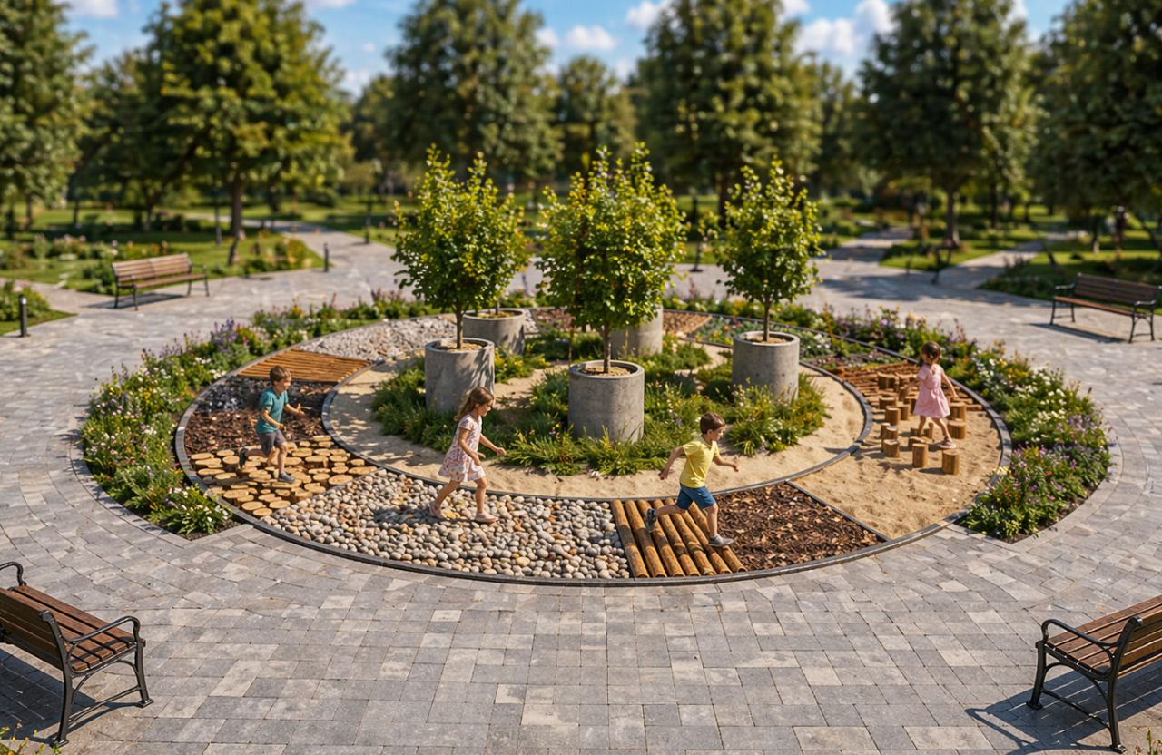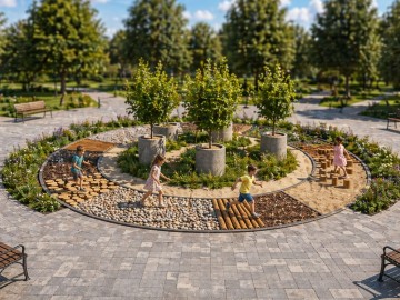 Навколо неї зроблять кільцеву доріжку, поділену на десять секторів із різними покриттями — від дерев’яних елементів до піску та каміння.