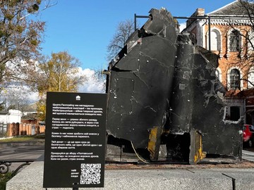 Уламок передали для експозиції представники благодійного фонду «Повернись живим», а поруч розмістили QR-код для бажаючих зробити внески.