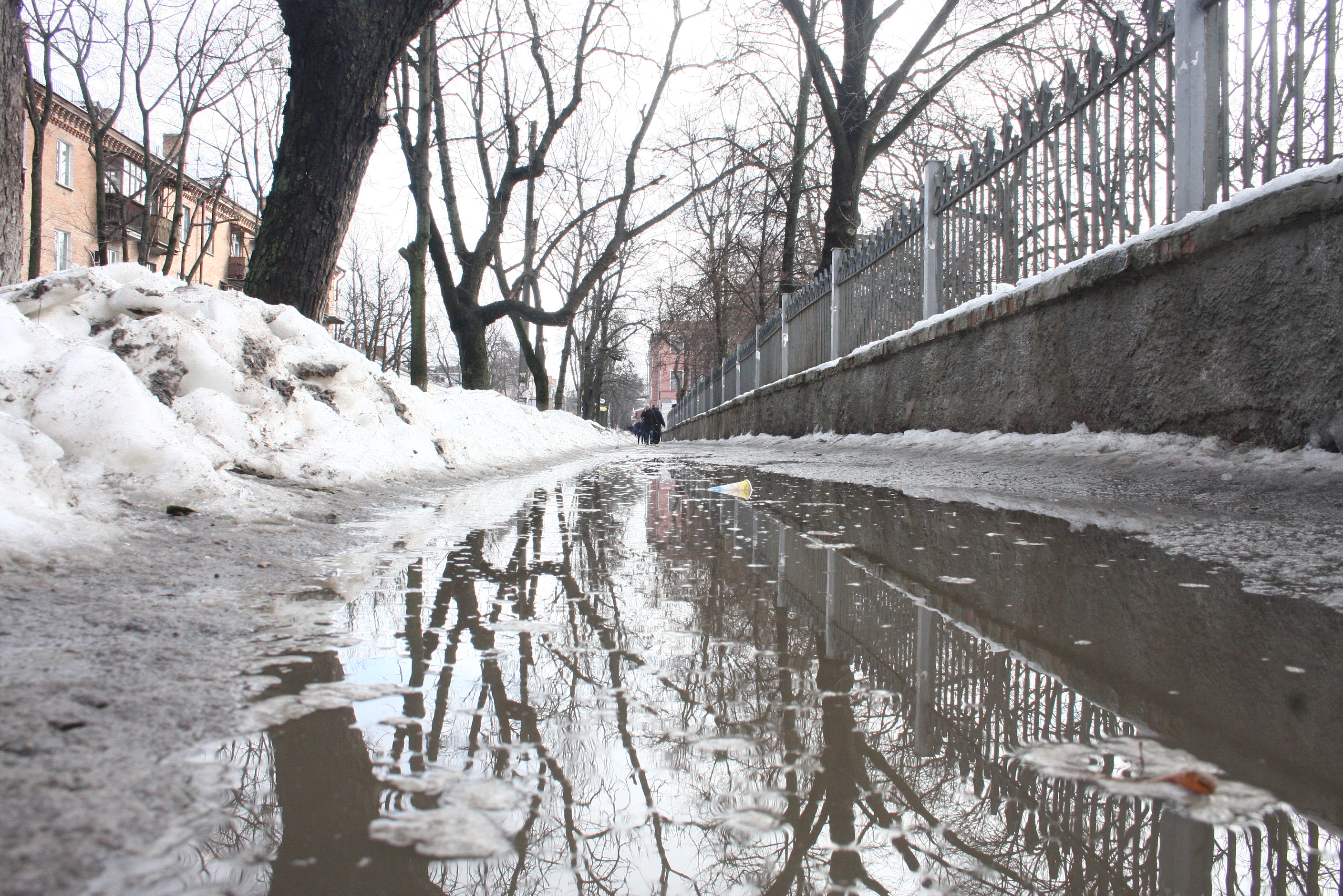 Кілька днів у місті тримається плюсова температура. Неприбраний вчасно сніг тане і перетворюється на розлогі калюжі. Що робиться у центрі міста - у фоторепортажі Олега Журавльова.