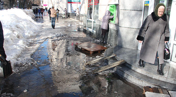 Вулиці міста потопають у талій воді під час січневої відлиги. Тротуарами важко пересуватися, з нечищених дахів падає сніг і крига, дороги заповнені водою. Фото Олега Журавльова.